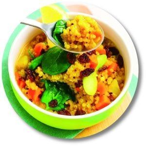 | Nguyên liệu: Hạt diêm mạch, hành tây, rau chân vịt, măng tây, cà chua, ớt chuông đỏ, dầu dừa Cách làm: Nấu chín diêm mạch riêng biệt. Phi thơm hành tây và xào các loại rau với bột cà ri và nghệ. Trộn hỗn hợp rau củ với diêm mạch đã nấu chín rồi dọn ra đĩa và thưởng thức. | Nguyên liệu: Cà rốt, nấm đông cô, dưa leo, đậu hũ, bột năng Nước sốt: Nước tương, tương cà, đường nâu Cách làm: Trộn các nguyên liệu và vo thành những viên nhỏ. Nấu chín trước, sau đó chiên cho đến khi vàng. Rưới nước sốt lên trước khi dùng. | Nguyên liệu: Trứng, bột mì, vừng đen, hành lá cắt sợi Cách làm: Trộn đều các nguyên liệu rồi đổ vào nồi cơm điện. Rắc thêm hành lá và vừng lên mặt, nhấn nút “nấu” và chờ cho đến khi nồi chuyển sang chế độ “giữ ấm.” |